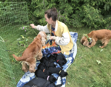Vi binder kransar medan hundar och valpar "hjälper till"..