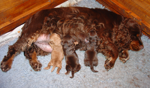 Här har hon fått sina valpar i juni -07 Det blev en röd tik, en leverfärgad tik och en liver & tan hane.